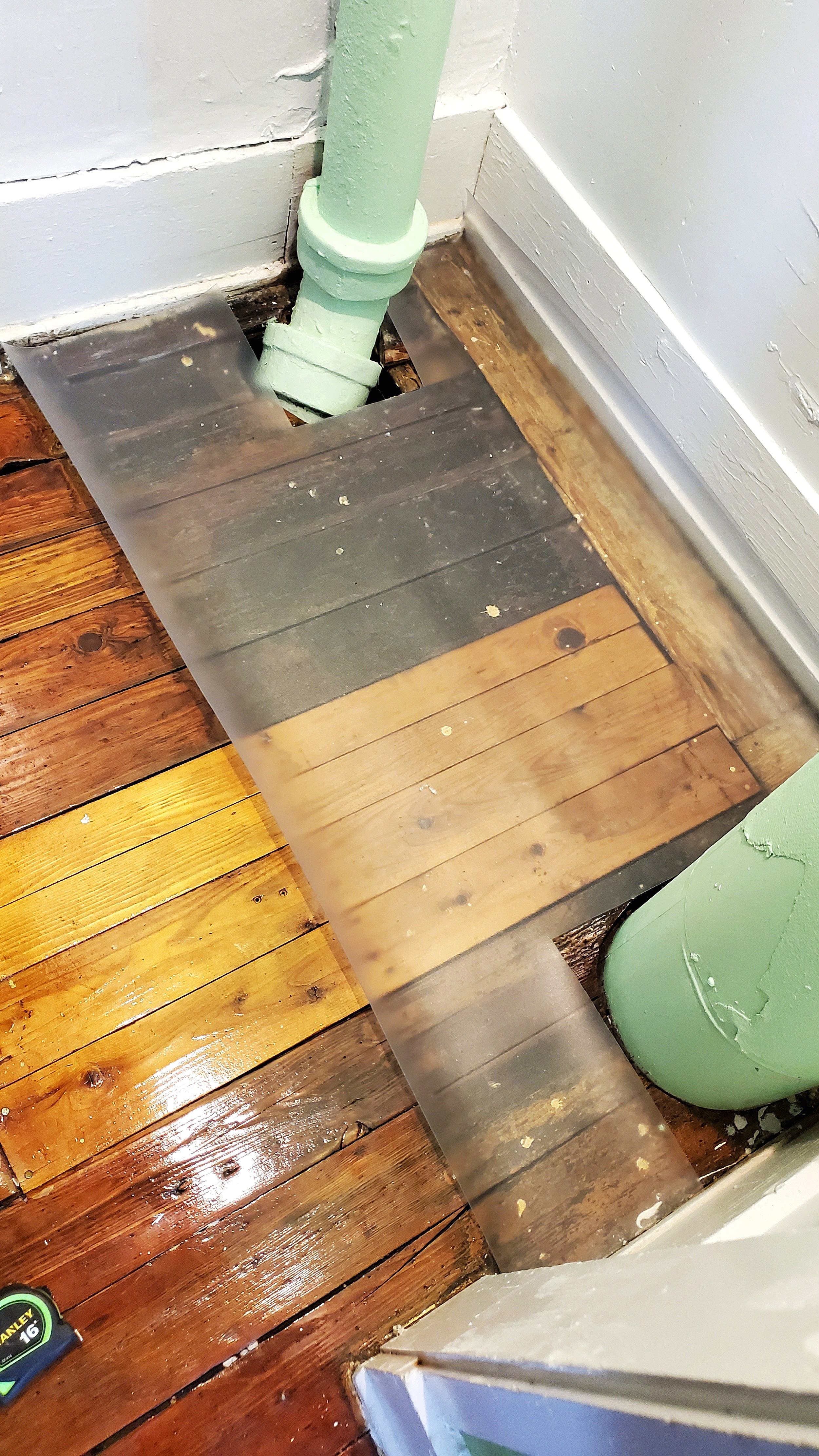 Measure the area your floor will cover. Since we wanted coverage on the baseboards against the back of the closet, too, we added a few inches for the g-floor to curl up against it and save it from cat splashes.