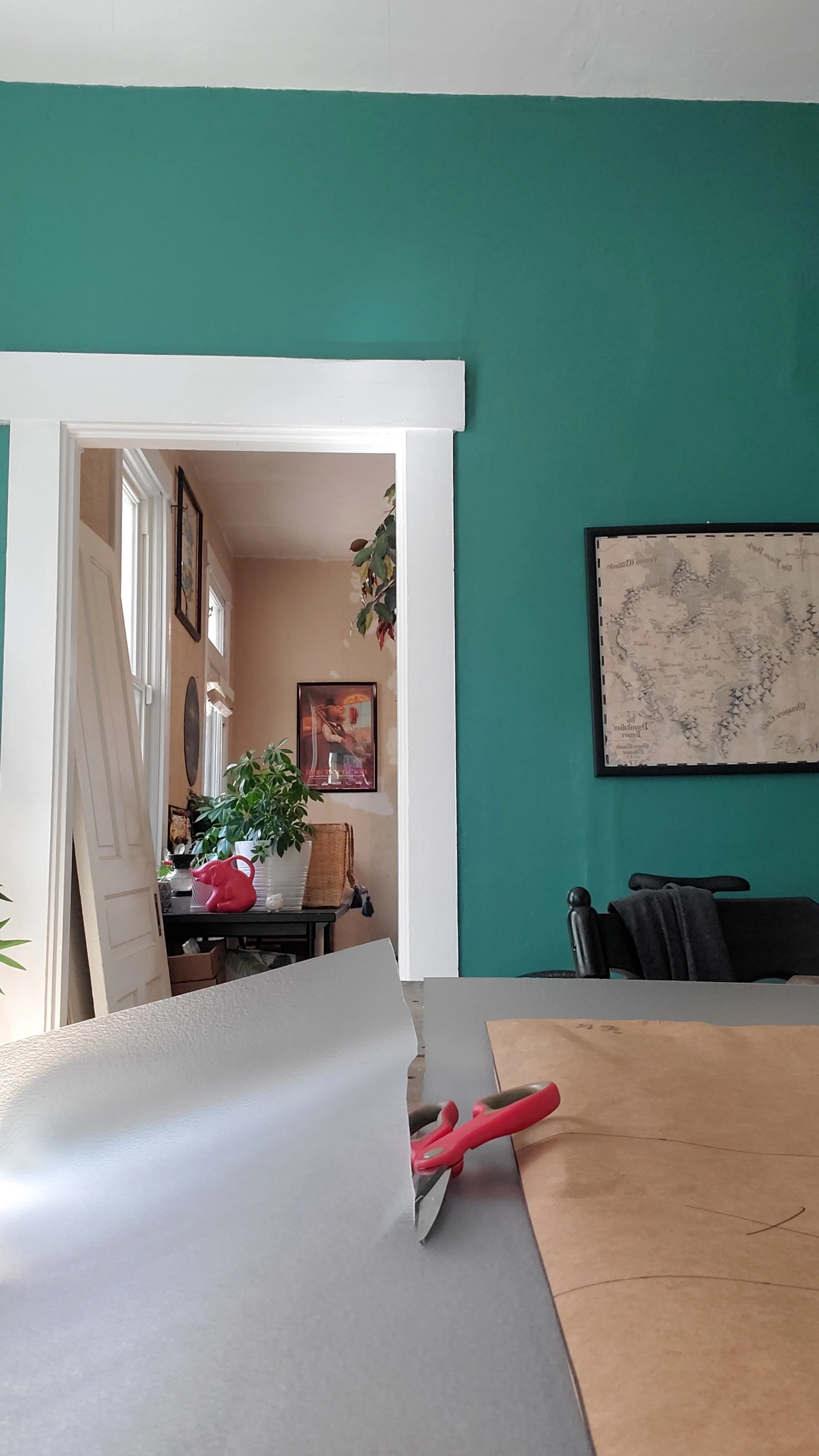 if the area you’re covering is a tricky shape (e.g. not square) i recommend you take the extra step of transferring those measurements onto paper. We have this giant roll of brown package paper which works very well for this purpose.